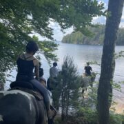 Wir treffen uns morgens und machen gemeinsam die Pferde fertig. Die Tour führt uns südlich Richtung Mien. Nach etwas über zwei Stunden erreichen wir den Pausenplatz, bei dem wir erst mit den Pferden zum Planschen und Trinken in den Mien gehen.